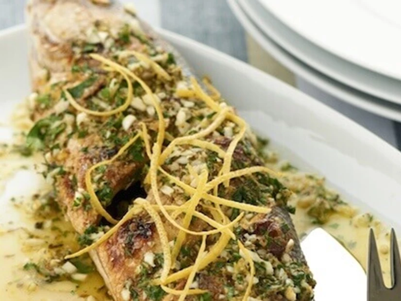 Aqueça uma grelha e cozinhe o peixe 3 a 4 minutos de cada lado. Transfira o peixe para um prato aquecido e verta o preparado de limão e orégãos sobre o mesmo.
