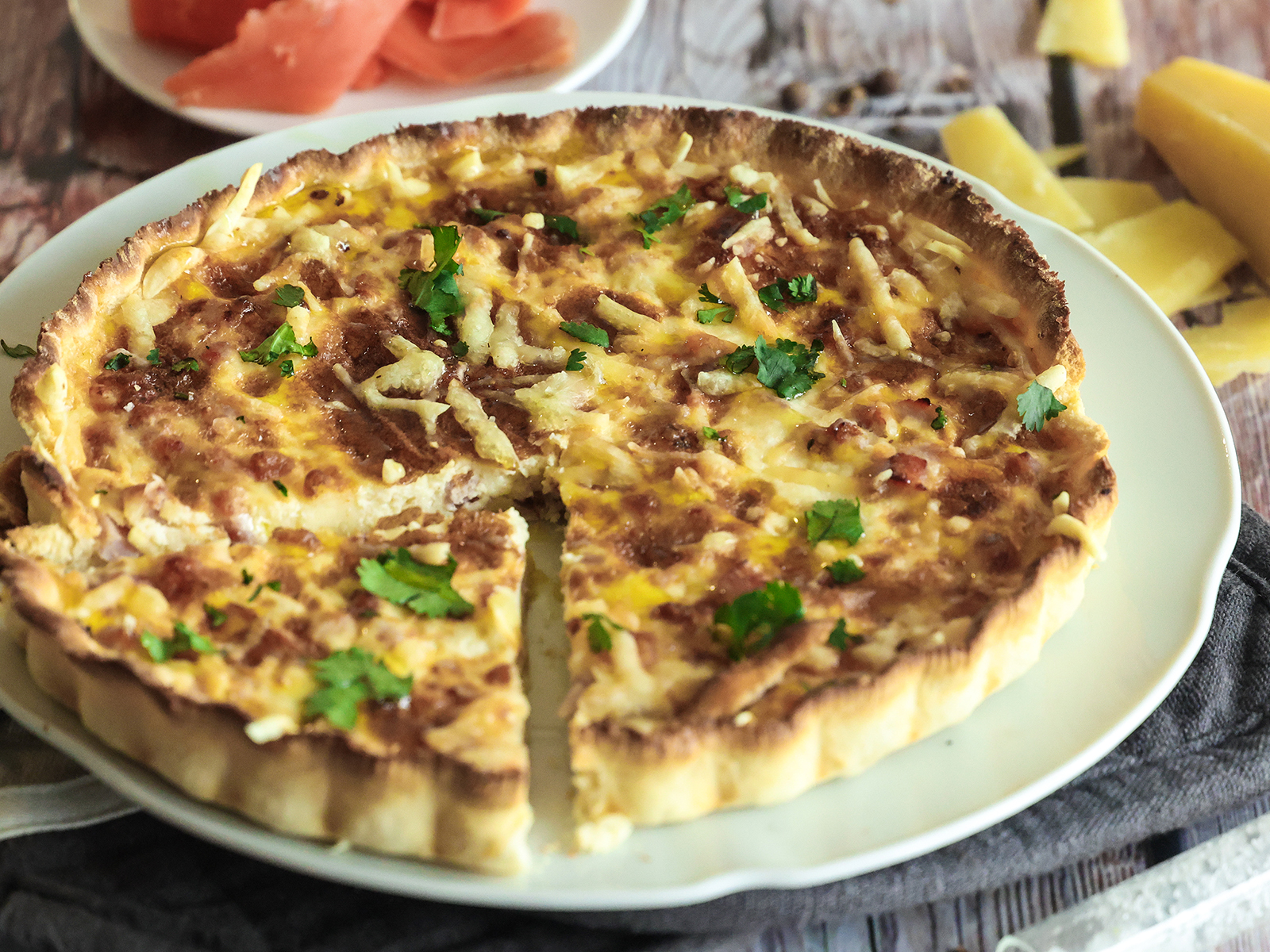 Comece por preparar os ingredientes da salada: lamine a cebola roxa, corte os tomates cereja em metades ou quartos, corte o abacate em fatias, corte o salmão fumado em tiras e reserve.