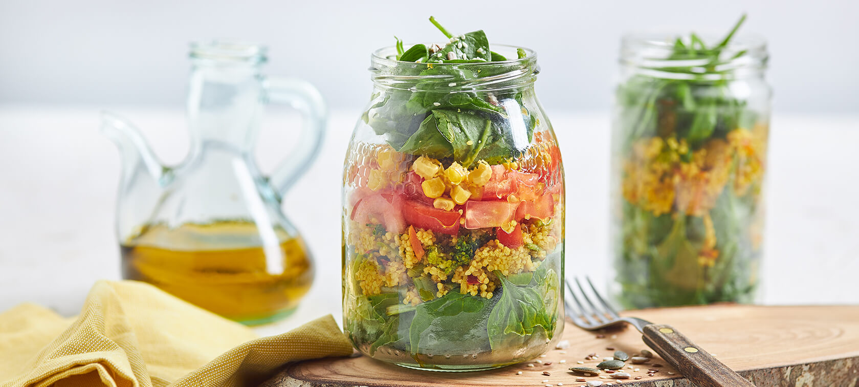 Em dois boiões de vidro faça camadas com os espinafres, o cuscuz, os tomates em cubinhos e o milho.
