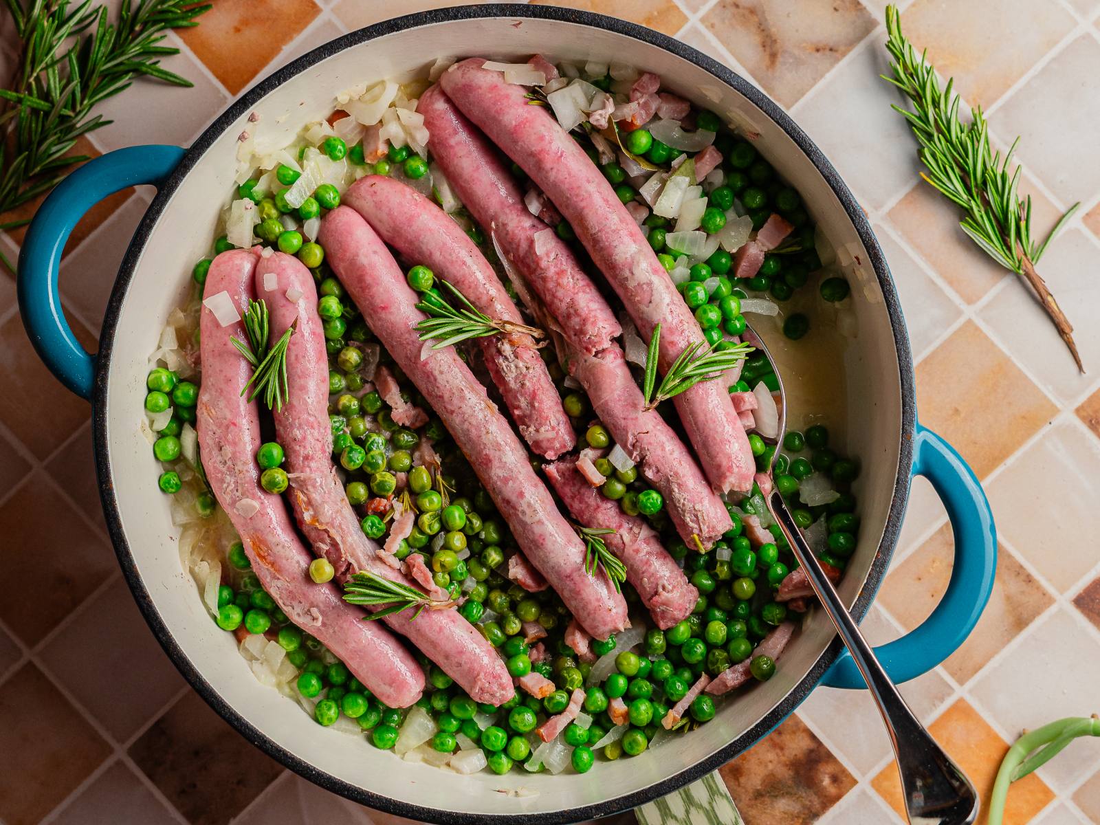 Junte as salsichas, as ervilhas e o alecrim, tempere com sal e pimenta e cozinhe por 12 minutos em lume brando.