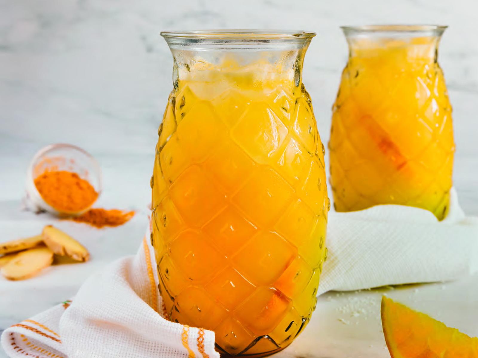 Adicione a curcuma, o gengibre e os sumos de limão e de laranja.
