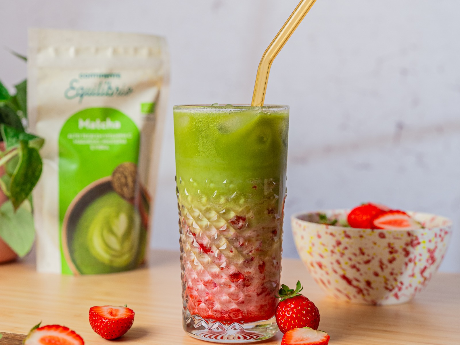 Adicionar gelo a gosto, 80 ml de bebida vegetal e a mistura de matcha