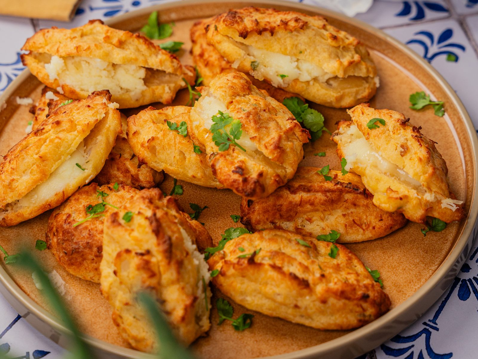 Comece por fatiar o pão de Rio Maior. Disponha numa travessa de barro redonda, regue com um 1 fio de azeite e unte bem. Leve ao forno a 180ºC por 15 minutos ou até tostar.