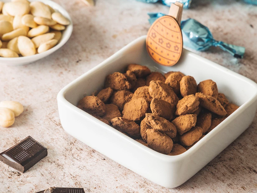 Transfira as amêndoas para este recipiente, tape-o e abane vigorosamente para que fiquem todas bem misturadas com o cacau e o chocolate em pó. Separe algumas que possam ficar coladas e volte a abanar.