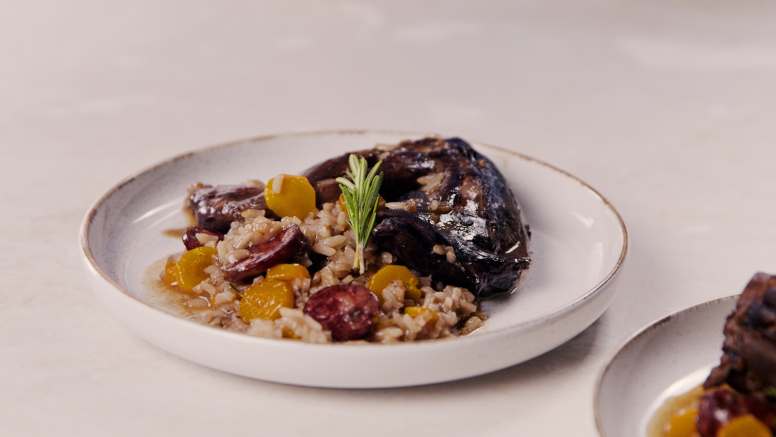 Acrescente o pato partido aos pedaços (não demasiado grandes), o vinho, os caldos, o pedaço de bacon inteiro, o chouriço cortado ao meio com a pele, a salsa, o louro e sal a gosto (opcional). Programe 38 minutos, a 100°C, velocidade 1 na Rotação Inversa.