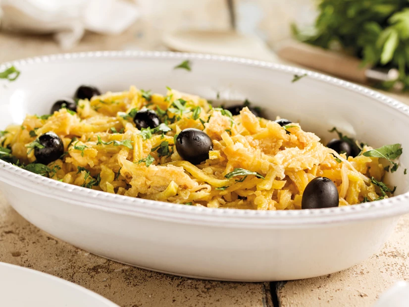 Desfie o bacalhau, programando 7 segundos, Rotação Inversa , na velocidade 4. Acrescente metade da batata palha e envolva com a espátula.