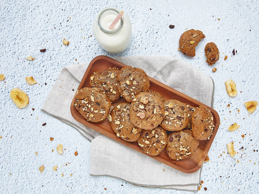 Faça pequenas bolas com cerca de 50 g cada e coloque-as num tabuleiro forrado com papel vegetal. Espalme ligeiramente com a ajuda dos dedos e polvilhe com as restantes nozes e pepitas de cacau.