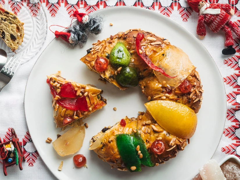 Disponha o bolo-rei sobre um tabuleiro forrado com papel vegetal. No centro, coloque um recipiente resistente a temperatura com um pouco de água, para que a massa não se una.
