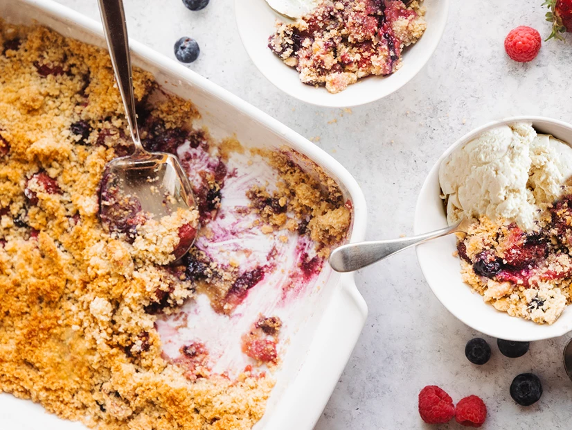 Espalhe o crumble por cima da fruta e leve ao forno cerca de 40 minutos (a superfície deve ficar dourada).
