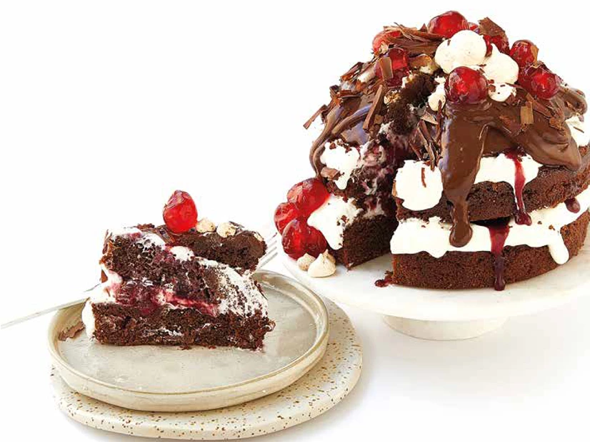 Desenforme e corte longitudinalmente o bolo em 3 camadas. Cubra a primeira camada com o chantili e calda de cereja. Coloque por cima outra camada de bolo e repita. Termine com a última camada de bolo e cubra com a ganache de chocolate. Decore com as cerejas e raspas de chocolate.