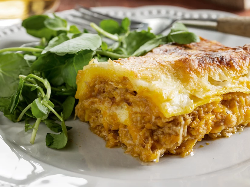 Barre o fundo de um pirex com um pouco de molho de carne e disponha placas de lasanha. Sobreponha outra parte de molho de carne e prossiga, alternando a massa e o recheio (a última camada deve ser de massa). Cubra com o molho bechamel e, por fim, com o queijo ralado. Leve ao forno cerca de 20 minutos.