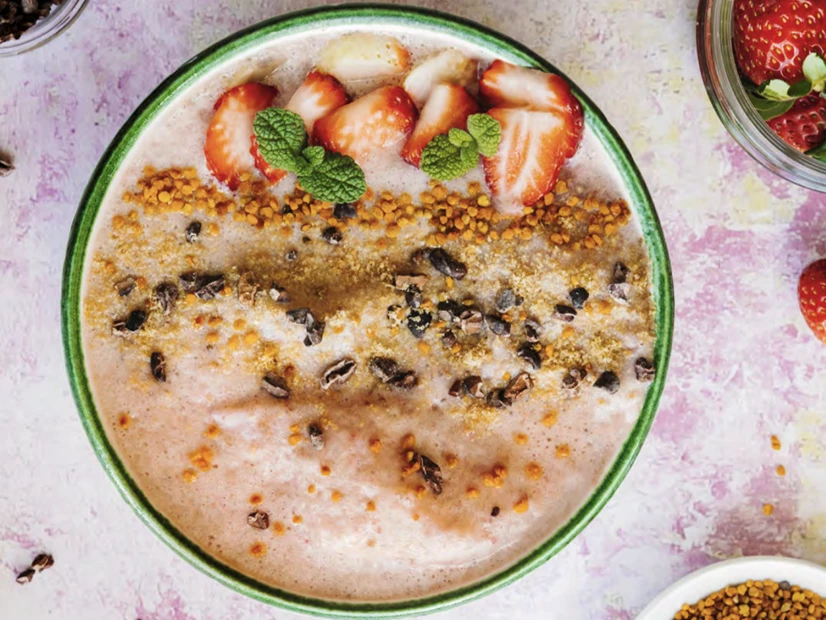 Transfira a papa gelada para duas taças. Decore com morango fresco laminado, pepitas de cacau e linhaça moída ou pólen em grão. Sirva de imediato.