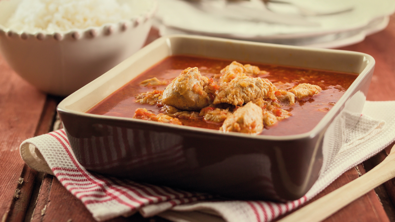 Acrescente o tomate em cubos, a polpa de tomate, o pimentão‑doce, o vinho tinto, a água e o caldo de carne. Retire a maior parte do sal do entrecosto. Introduza‑o no copo. Monte a bandeja de vapor e programe 30 minutos, na Rotação Inversa, na Função Vapor com a velocidade 1.