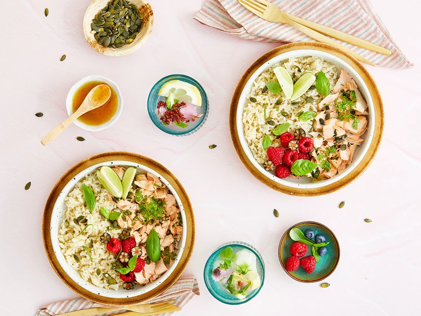 Sirva o arroz com o salmão em lascas. Decore com as framboesas, os mirtilos, o manjericão e as raspas de lima e sirva com o molho.