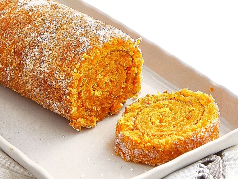 Desenforme de imediato sobre um pano polvilhado com açúcar e enrole cuidadosamente no sentido do comprimento.