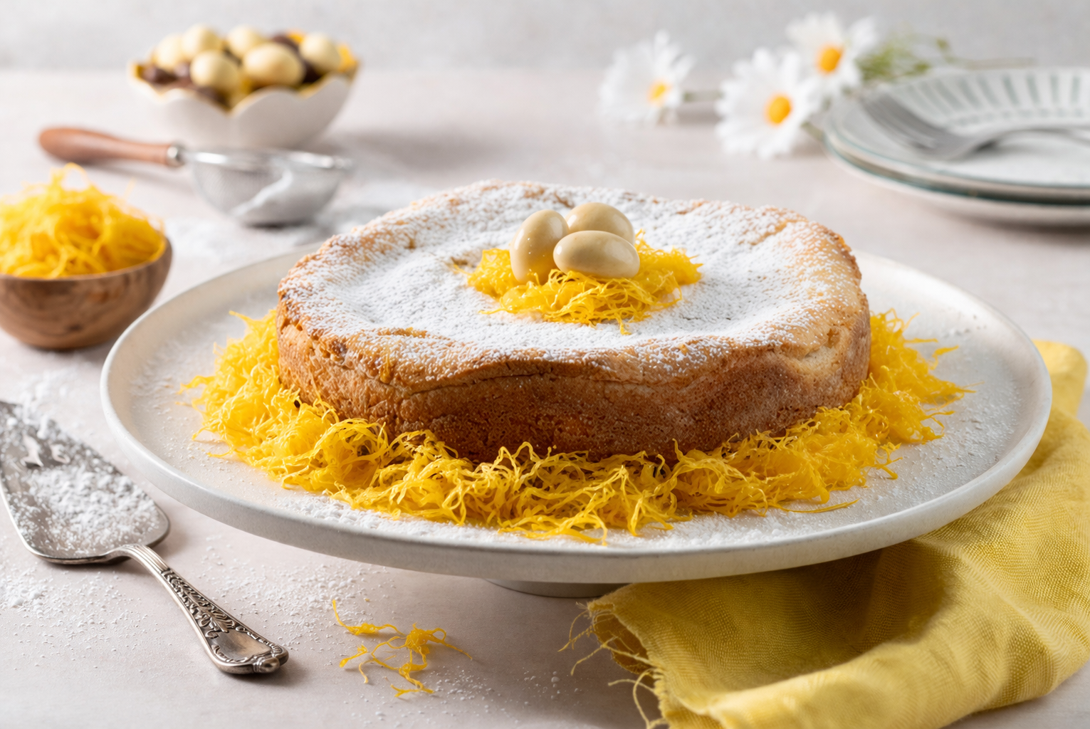Desenforme, ainda quente, sobre uma folha de papel vegetal polvilhada com açúcar e enrole cuidadosamente.